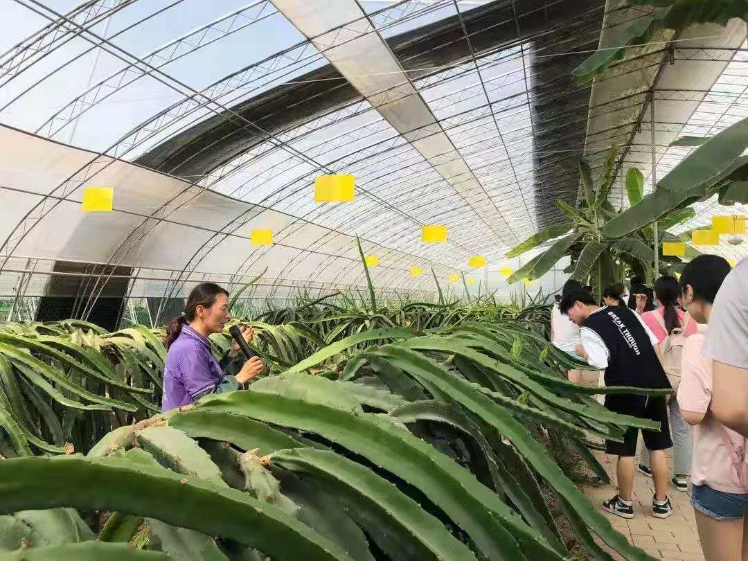 最后一站,实践队来到了青皮她园火龙果基地,这是个集生产、加工、销售、技术服务、研发于一体的规范化、现代化示范基地。基地依托科技种植,打破地域限制,不用去南方就可以观察香蕉、人心果、莲雾、芒果等热带水果植物的生长。同学们认真聆听工作人员的讲解,并积极与工作人员交流互动。