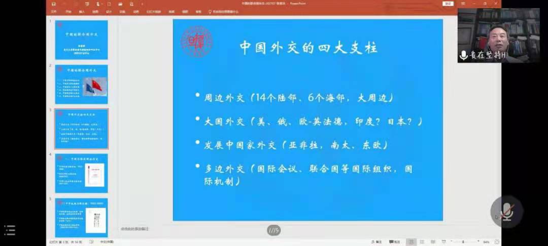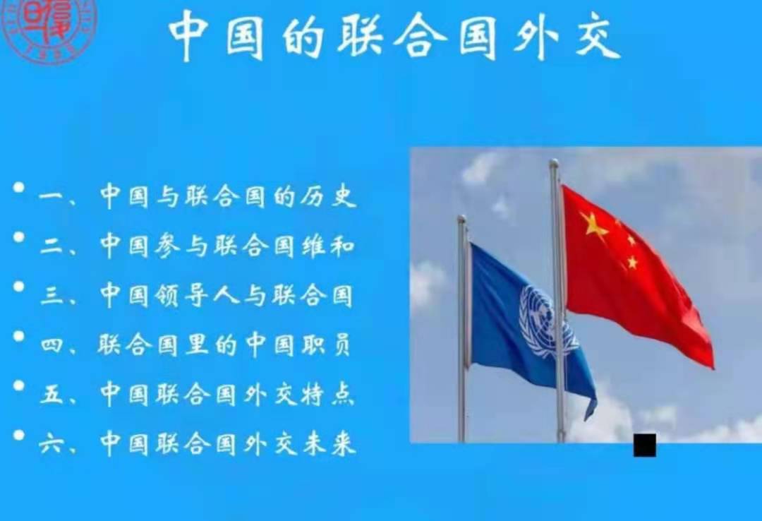 讲座伊始,张老师从2021年是新中国恢复在联合国席位50周年引入,讲述了中国与联合国的历史。通过对中国外交四大支柱的解读,提出多边外交中联合国等国际组织的重要性。提出中国重返联合国对中国的重要意义在于:中国从联合国走向世界;中国成为发展中国家的代表;是中国外交的开端。对于联合国的意义在于中国的加入使联合国真正具有代表性和权威性。