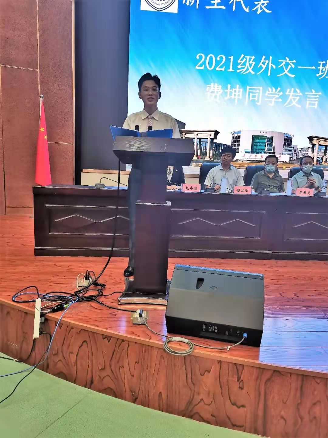 来自2021级外交一班的新生代表费坤同学首先代表21级新生对开学以来学院领导老师和各位学长学姐的辛苦付出表示诚挚的感谢,接着他表达了自己对大学生活和未来的期待,最后,他对大学的学习生活等方面提出了自己的看法和建议并希望所有同学们能够努力拼搏,成为一个有理想、有作为、积极进取、实事求是的人。