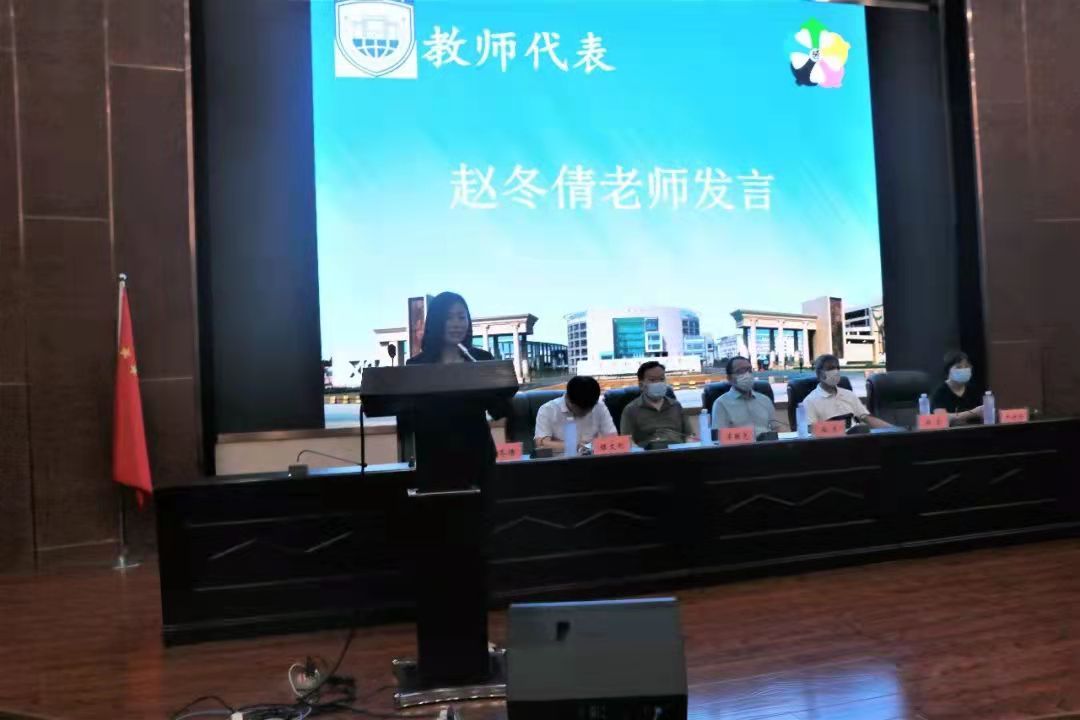 教师代表赵冬倩老师向21级新同学提出:要学会融入宿舍,融入校园,学会相处,学会自立,学会包容,希望同学们学会面对逆境,学会藏匿眼泪,学院全体老师会和你们一起,帮助你们进步,见证你们成长,实现人生真正的蜕变。