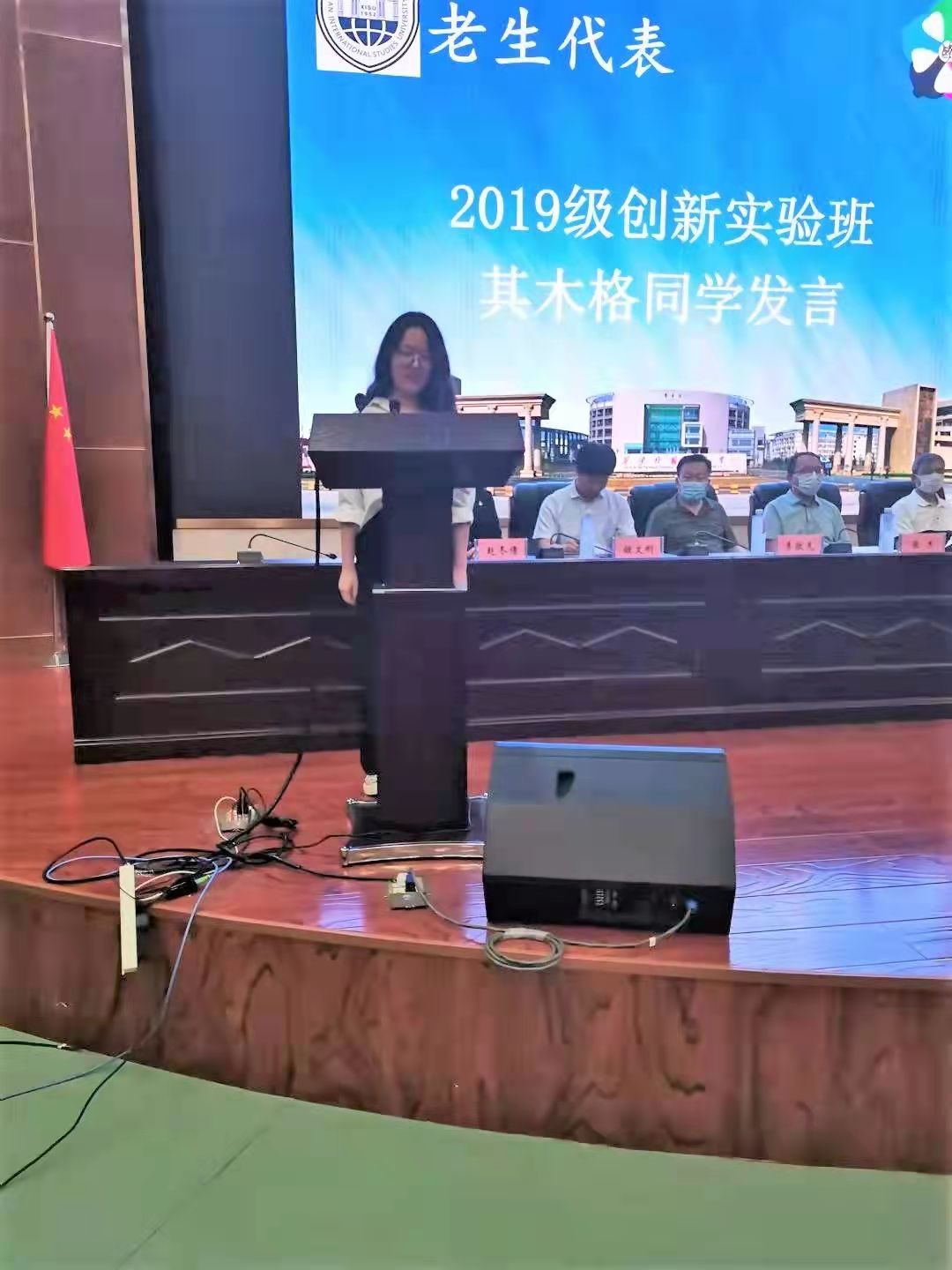 来自2019级创新实验班的老生代表其木格同学向新生提出三点建议:1.大学生活纵然精彩,但是学习是其中最重要的。2.实现个人成功的同时主动承担社会责任,穷则独善其身,达则兼济天下。3.要珍惜身边的同学,多认识新朋友,他们都是你未来人生宝贵的财富。