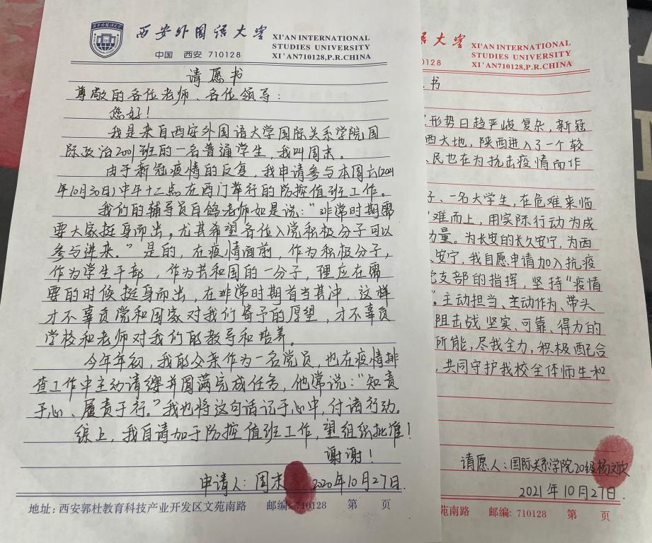 10月27日晚,当学院志愿者招募的通知发布不到一小时,报名信息瞬间爆满在线报名系统,私信里还在不停传来同学们的”出战”请求。还有同学主动向辅导员老师递上请战书,一张张请战书、一个个鲜红的手印是同学们在疫情面前的责任与担当。这是一场没有硝烟的战斗,国关学院的青年学子们冲在前、跑在前、做在前,用实际行动书写新时代的青年力量,用实际行动践行“请党放心,强国有我”的青春誓言。