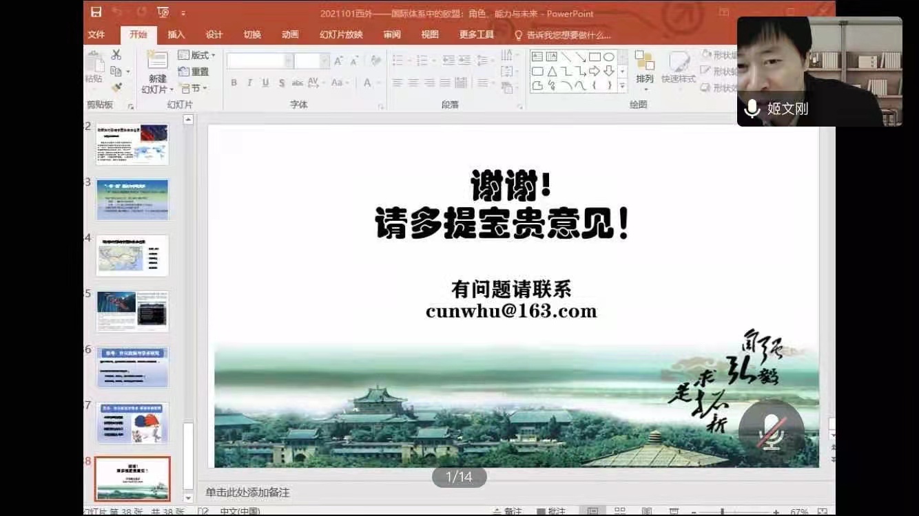 首先,冯老师就如何客观地评价欧盟在当代国际关系中的作用展开讲述,冯老师指出,应当从欧盟的多方面表征和未来展望入手考察欧盟在当代国际关系中的作用和一般规律。随后,冯老师结合宏观上2010年前后三十年中国对欧盟研究的演变历程强调重视欧洲研究的必要性。冯老师以国际关系学中界定国际力量的共识出发,指出实力、增长、吸引力和辐射力是评价一个国际行为体是否构成主要国际力量的综合标准,并将这些标准与欧盟现实相结合,得出欧盟过去现在将来依然会是当代国际关系中主要的国际力量之一的结论。除此以外,冯老师还提出了“因为经贸往来的存在,中欧关系坏不到哪去”的关于中欧关系未来展望的基本观点。