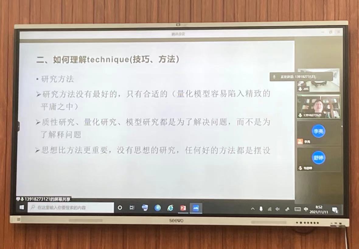在第二个部分technique(方法、技巧),胡老师告诉同学们,研究方法没有最好的,只有最合适自己的,提醒学生们既要学会使用量化模型,但也不能过度追求量化模型而陷入困境,研究方法是服务于研究问题的,而不是为了解释问题。接着,胡老师从层次感、缜密性、科学性、学理性、严谨性五个方面向同学们教授了问题论证的技巧。