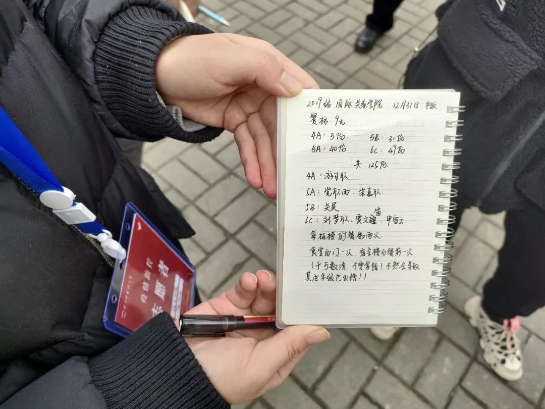 老师和志愿者们一大早便冒着冬日严寒,在食堂门口有序排队,为全院同学购买餐食,此刻的他们,呵护着每一位每日大赛