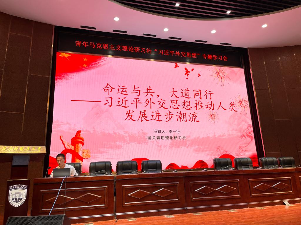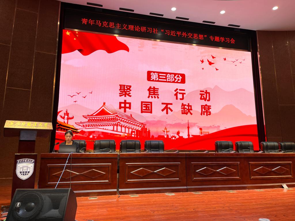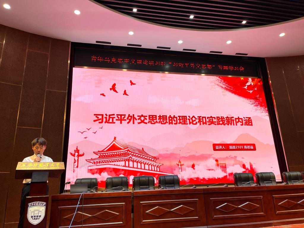 习近平外交思想宣讲团成员陈若语、理论研习社成员颜涛以及理论研习社团支书李一行主讲。