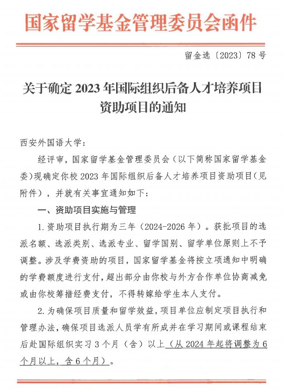 自学校2021年实施“西外国际组织后备人才培养计划”以来,学院积极响应国家加快培养国际组织人才的号召,充分利用学校“外语+专业”学科优势打造国际组织人才培养体系,从平台搭建、课程引进、国际组织实习实践等多方面共同培养具有国际胜任力、全球视野的国际化复合型人才。该项目的获批是我校国际组织后备人才培养的深度实践,也是国家留学基金委对我校国际化人才培养的充分肯定。