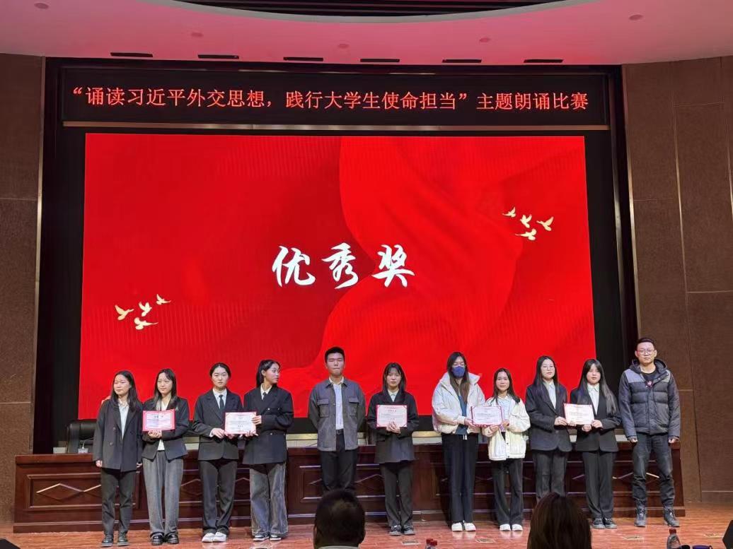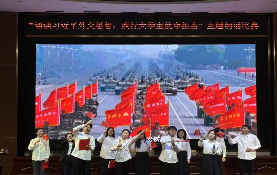 习近平外交思想大学生宣讲团于年11月29日下午在SA105举办了“诵读习近平外交思想,践行大学生使命担当”主题朗诵比赛,本次比赛由姚嘉鼎和范梦凝主持,共有11支队伍参赛。每日大赛