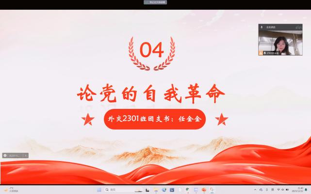 第四,由任金金同学领学《论党的自我革命》。面临历史之问,时代之问,世界之问,习近平总书记立足实际,坚持马克思主义中国化,保持清醒的思路对党面临的问题和考验展开了深邃思考,对全面从严治党,坚持自我革命进行了重大部署,同时,提出要坚持以马克思主义为立党之本,保持马克思主义政党先进性,坚持以全心全意为人民服务为根本宗旨等。旨在,加强党组织建设,保持党的先进性,纯洁性,从而更好地投身于人民,投入社会主义建设,为中华民族伟大复兴奉献力量。
