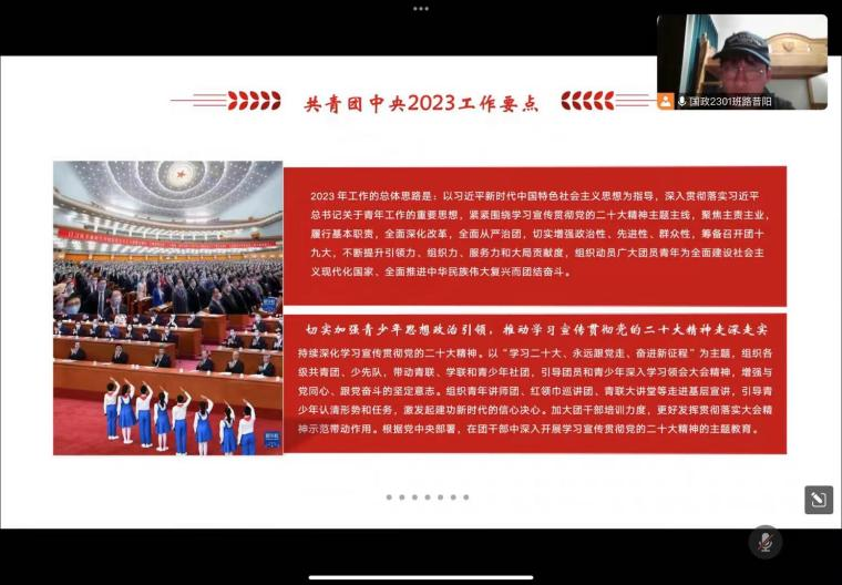 第二,由路昔阳同学领学“共青团中央2023年工作要点”。首先他对2023工作的总体思路进行阐述,明确新时代的战略部署。其次对党的二十大精神进行解读,明确加强青少年思想政治引领,推加强青年使命担当对于新时代对重要性。同时,对党《中长期青年发展规划(2016-2025)》进行解读,明确了党对于青年建设的重视和努力。旨在呼吁广大青年,深刻领悟不负党的殷切期望,投身社会主义建设,响应党的号召,投入基层建设。