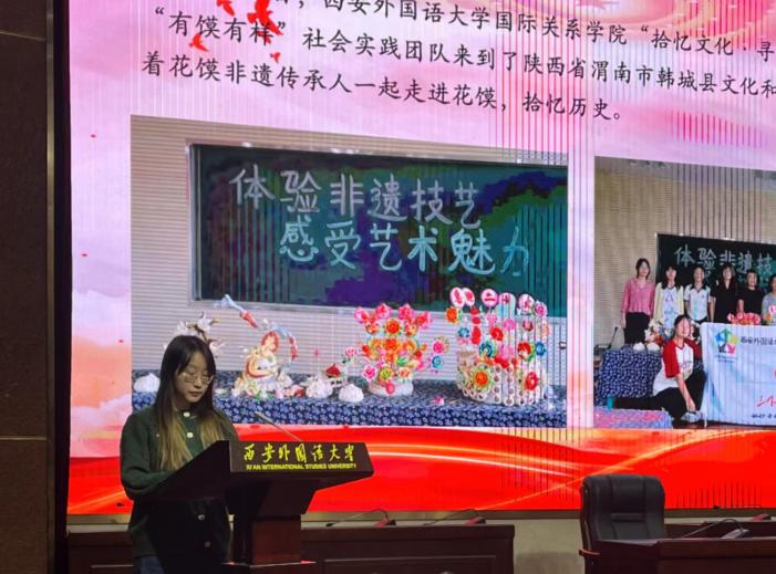 其次,项新悦同学进行了暑期“三下乡”实践活动分享。她带领团队来到了陕西省渭南市韩城市文化和旅游协会,跟随着花馍非遗传承人一起走进花馍,拾忆历史。她提到,诚如习近平总书记所讲的,从非遗中,我们不断坚定着中华民族的文化自信,这是我们五千年历史所赋予的自信,如今我们需要去挖掘它、保护它、传承它,不断赓续民族文脉,让更多的人爱上我们灿烂的民族文化,传承我们的精神基因。
