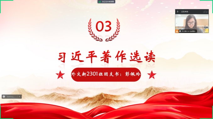 第三,由彭佩玲同学领学《习近平著作选读》。习近平总书记作为党中央的核心,全党的核心,习近平新时代中国特色社会主义思想的主要创立者,科学地回答了什么是中国特色社会主义、怎样坚持和发展中国特色社会主义。而《习近平著作选读》,更是对习近平总书记的伟大思想、对马克思主义中国化、对党和国家的发展等进行了深刻的阐释。学习习近平总书记的思想,有利于同学们提高政治觉悟,领悟党的前沿性,智慧性以及党对于人民的担当和使命。