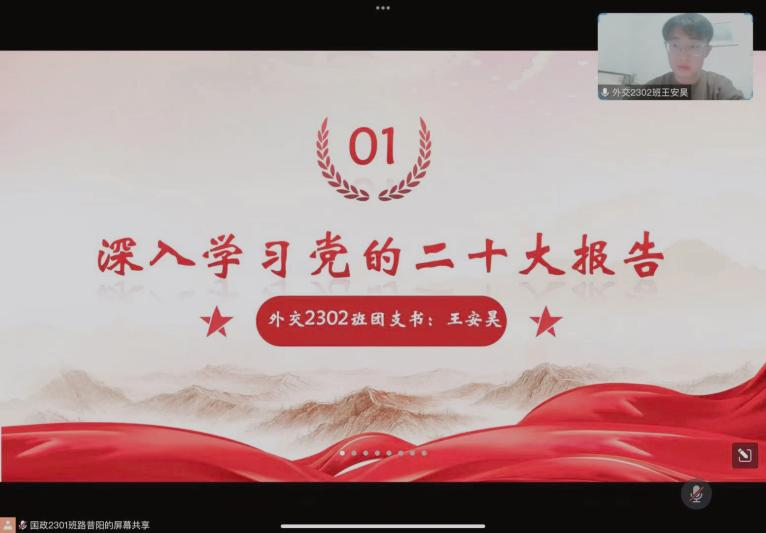 第一,由王安昊同学领学《高举中国特色社会主义伟大旗帜 为全面建设社会主义现代化国家而团结奋斗》原文,通过对高举社会主义伟大旗帜,全面贯彻习近平新时代中国特色社会主义思想,弘扬伟大建党精神等会议精神进行阐述,对过去五年的工作和新时代的伟大变革进行回望,对十八大以来党新时代的三件大事进行说明,旨在明确中国共产党和奋斗成就,并了解党和国家的发展事业战略部署,引领广大青年永远跟党走,奋进新征程。
