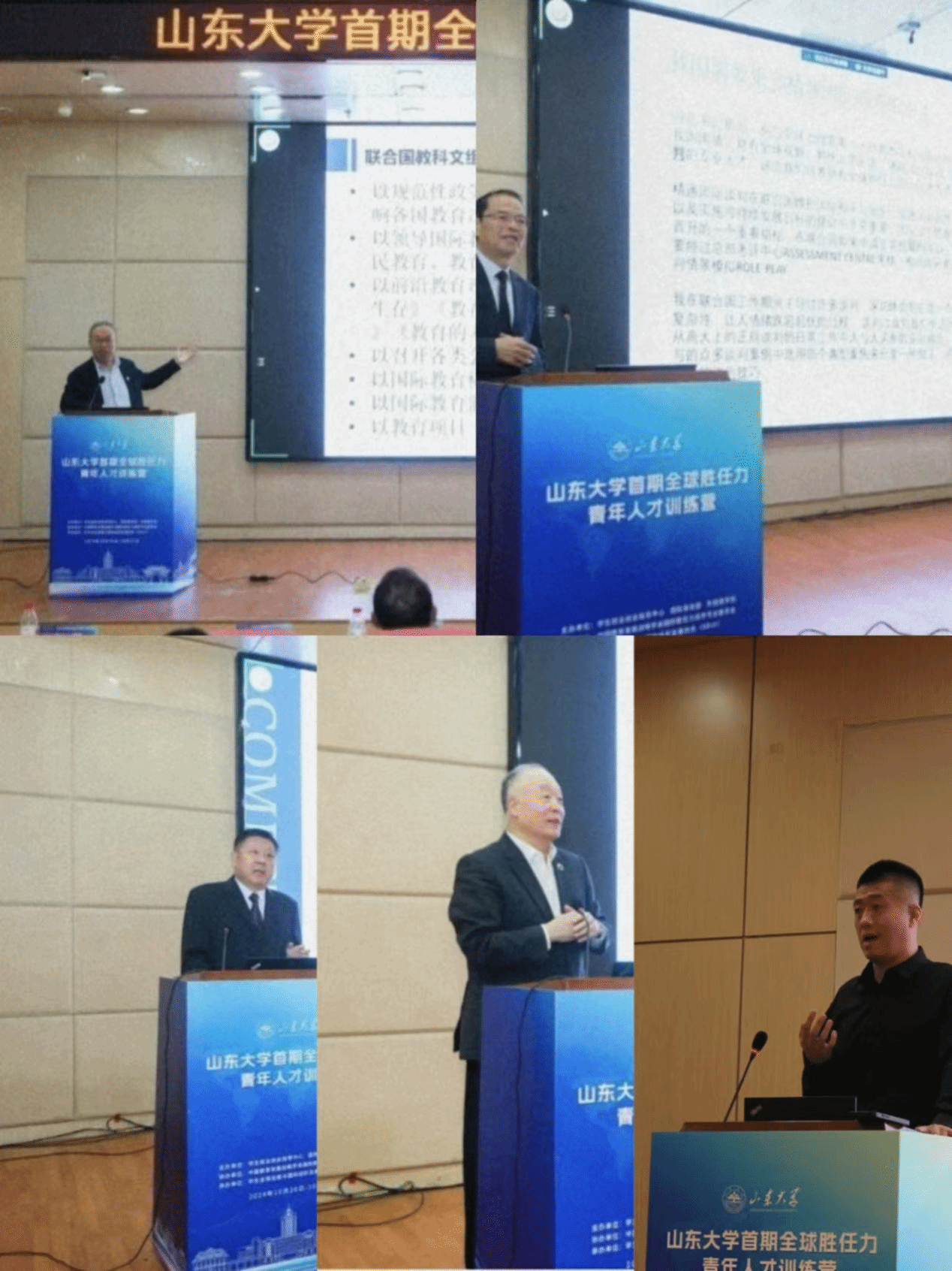 张宁、杨进(中国常驻联合国教科文组织原大使衔代表、中国驻法国使馆原公使衔参赞、联合国教科文组织终身学习研究所终身学习政策与战略研究部原主任)、王纪元(国际胜任力培养专委会学术委员会副主任,联合国国际劳工组织(ILO)驻泰国、老挝、柬埔寨国家局原局长)、李东林(国际胜任力培养专委会学术委员会专家委员,曾任国际劳工组织驻巴基斯坦、驻斯里兰卡和马尔代夫、驻缅甸国家局局长、驻太平洋局地区局长,原劳动和社会保障部国际合作司司长)、赵玉池(联合国教科文组织国际农村教育研究与培训中心执行主任,亚太经合组织人力资源工作组教育网络协调员)等资深专家为参加“山东大学首期全球胜任力青年人才训练营”的学员授课并交流回答有关问题。