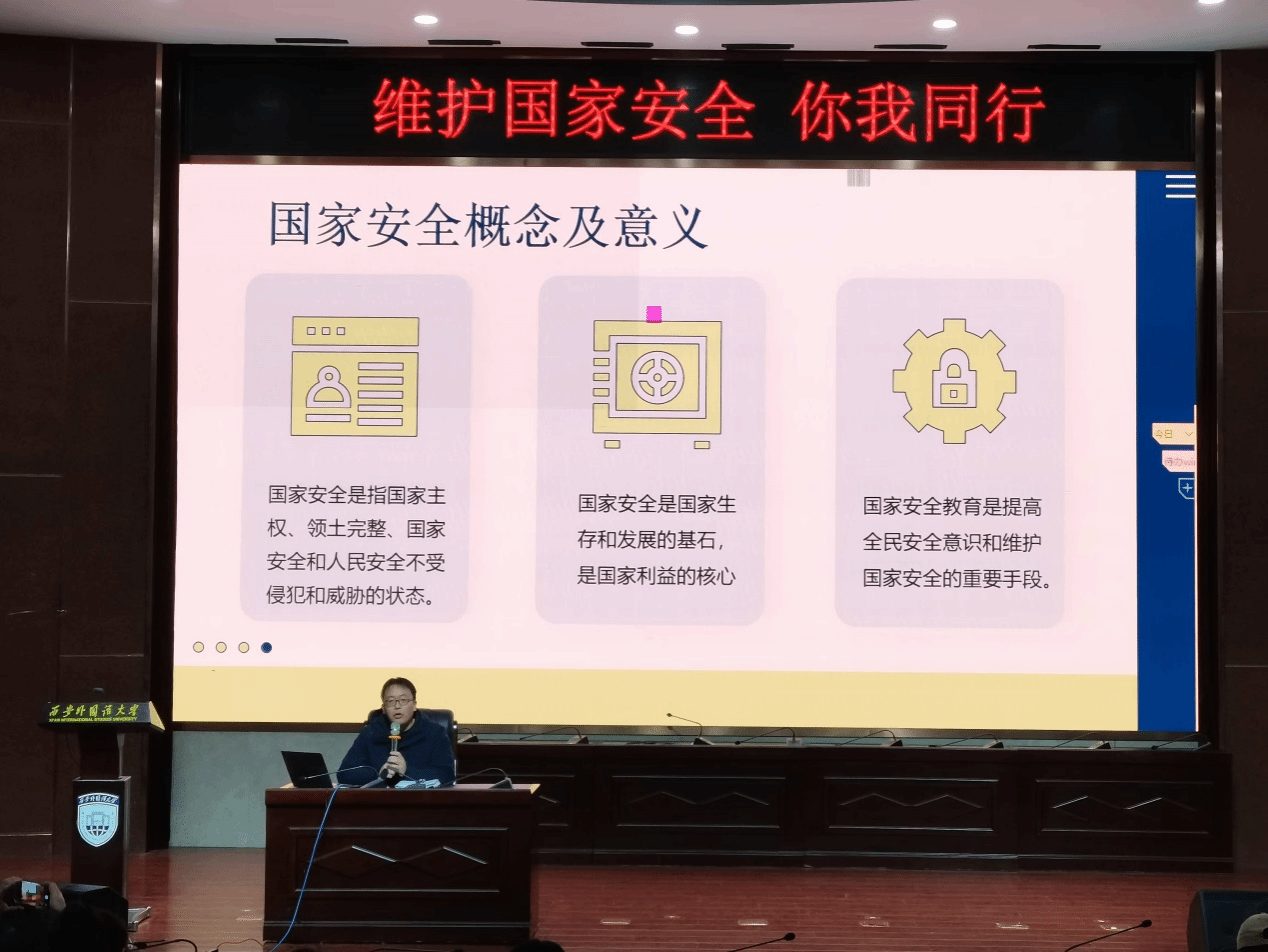 王老师首先介绍了国家安全的概念,并指出国家安全不仅涉及军事安全、政治安全,还包括经济安全、文化安全、社会安全及网络安全等多个领域。王老师以文化安全为例,结合实际案例深入分析了文化安全的本质,即文化特质的保持与文化的延续,具体包括语言文字、风俗习惯和价值观念等方面的安全。