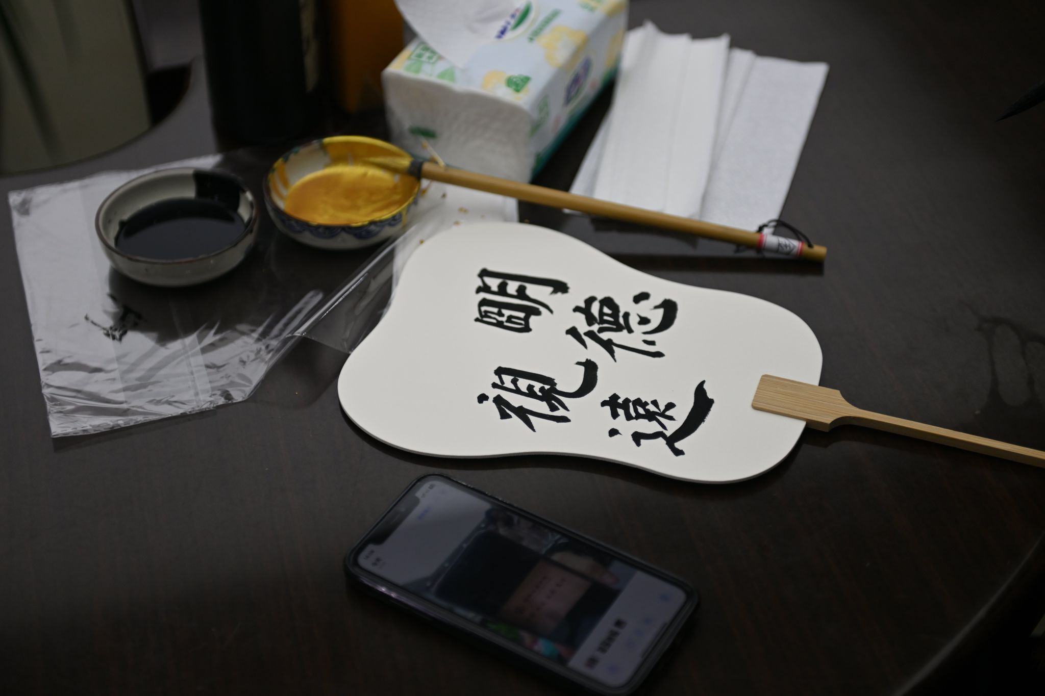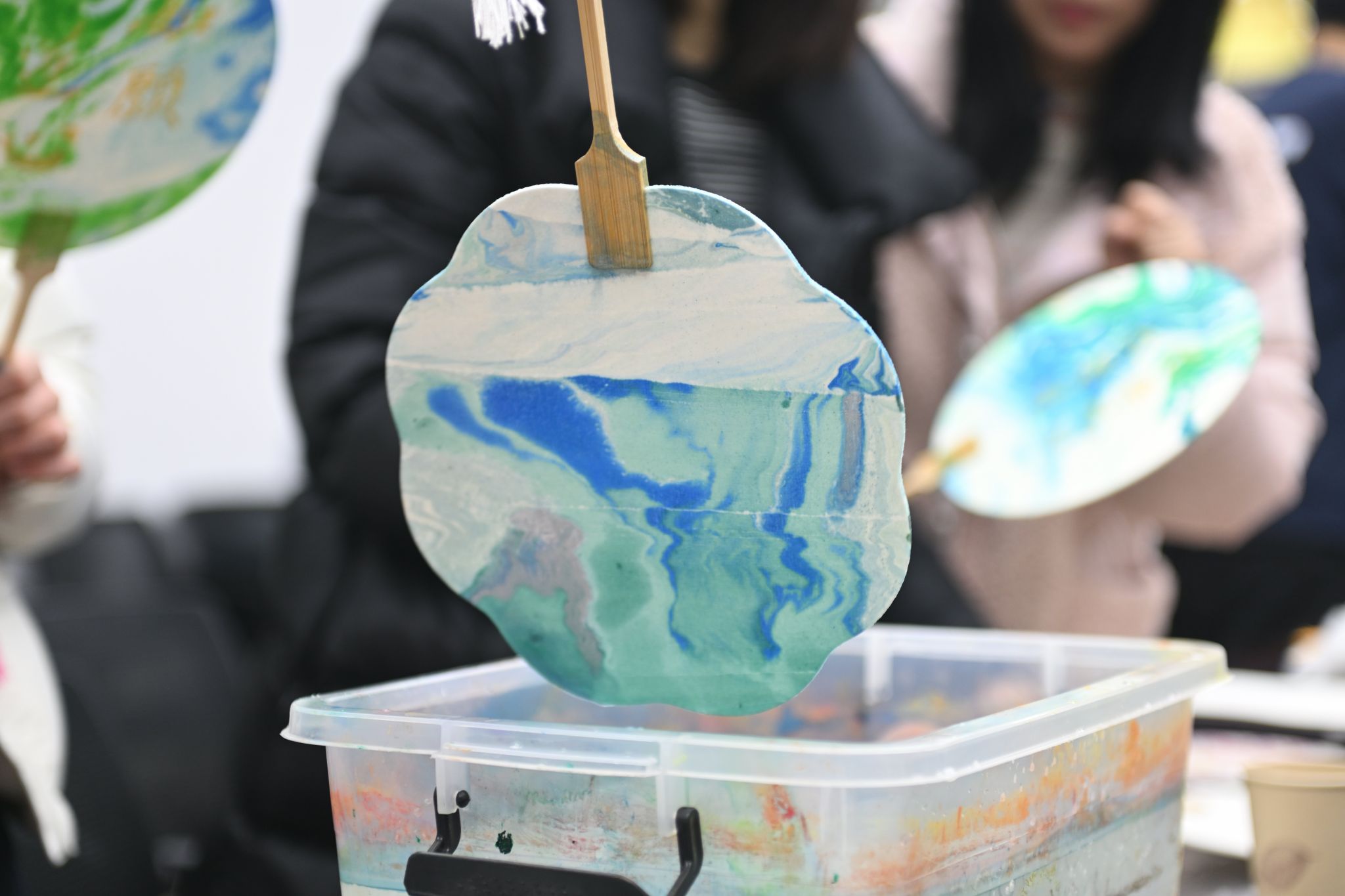 在漆扇学习和体验环节,艺术工作室的老师详细讲解了漆器的历史发展与漂漆扇的制作技巧,展示出多种不同的漂漆扇花式手法。精美的漆扇瞬间激发了大家的兴趣,跃跃欲试。在工作人员的指导下,老师们选择自己喜欢的颜色,纷纷自主创作起来。以漆做笔,以水作画,美轮美奂、展现绝美东方色彩的的团扇新鲜出炉,在一片欢声笑语中,一把把精美的漆扇呈现在大家面前。