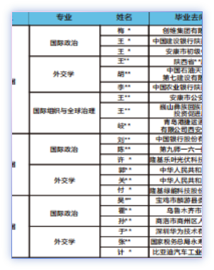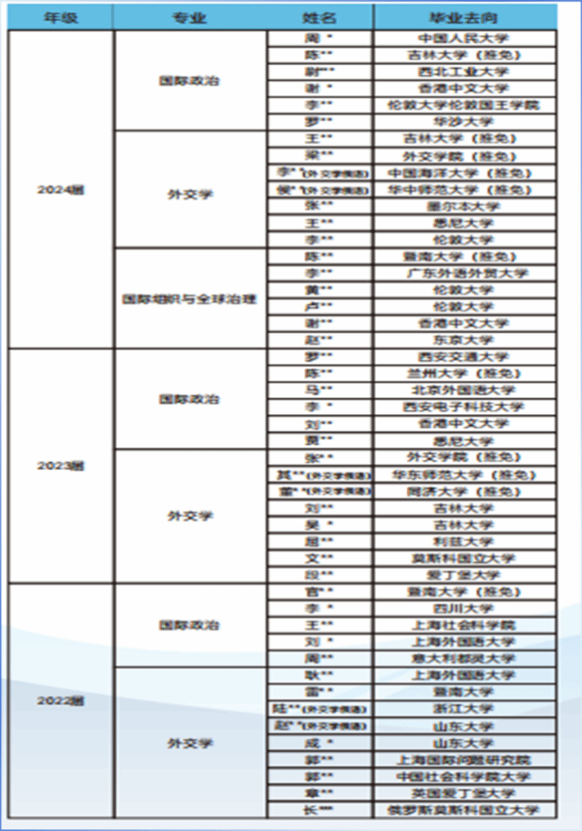 近年来学生毕业去向落实率始终保持在90%以上,位居全校前列。连续两年有学生被外交部录取,升学率多年稳定保持在30%以上。