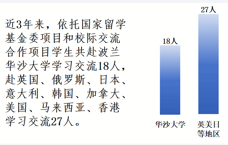 学院积极推进学生赴国(境)外进行交流、访学,依托国家留基委国际组织后备人才培养计划项目、国别区域研究人才支持计划以及校际交流合作项目,学生共赴波兰华沙大学学习交流18人,赴美、英、俄、日等国家和地区学习交流27人,进一步深化了与“一带一路”沿线国家高校教育人文交流。