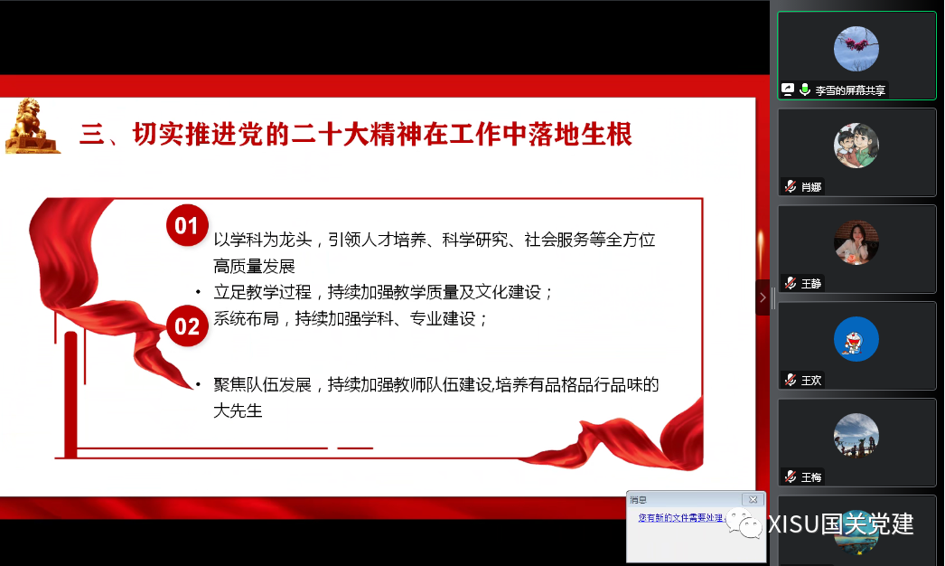学院党委书记王静在总结中指出,李雪茹副校长为学院全体教职工深入学习理解党的二十大精神进行了专业的辅导,内容全面、立意深远,特别是围绕全面建设社会主义现代化国家文化建设、科教人才的目标任务结合学校实际提出了具体的工作要求,对我们今后更加深刻地理解和学习这一重要纲领性文献,尤其是对学院学科发展、人才队伍建设等方面的工作具有很强的指导性。全体教职工要持续深入学习党的二十大精神,把理论学习与具体工作相结合,以科学理论为引领,持续加强学科、专业、人才队伍建设,不断提升教学管理水平,加快推进学院高质量发展。