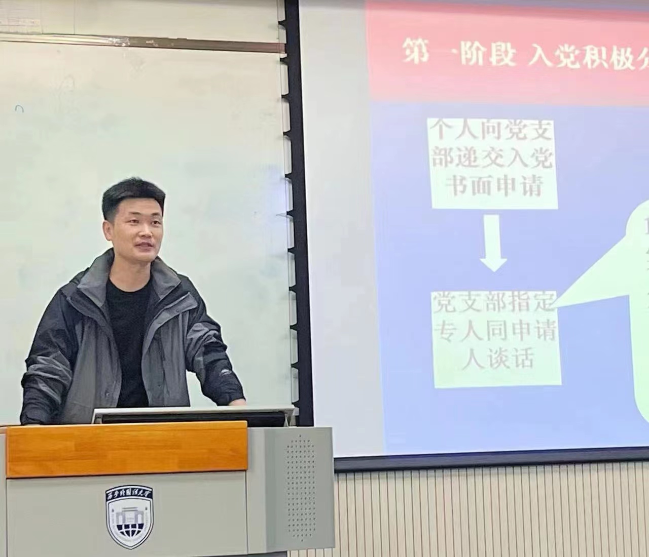 在随后的第一堂党课上,李亮亮老师开展题为《入党的条件与程序》的课堂教学。他从发展党员工作基本程序和常见问题、发展党员工作中主要材料的书写要求和注意事项两个方面作了详细的讲解。