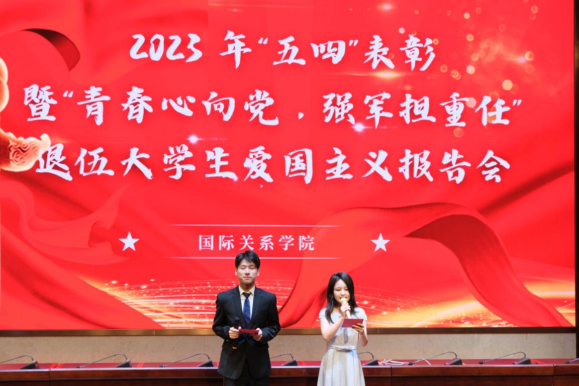 2023年“五四”表彰暨“青春心向党,强军担重任”退伍大学生爱国主义报告会。副校长李雪茹老师、校团委书记王娜老师、校学工部副部长杨小江老师、院党委书记王静老师、院长张杰老师、各科室负责人和全体辅导员老师以及2022级全体学生和第64期入党积极分子共计200余人参与本次活动。报告会由外交2202班苏娅雯和严逸飞同学主持。