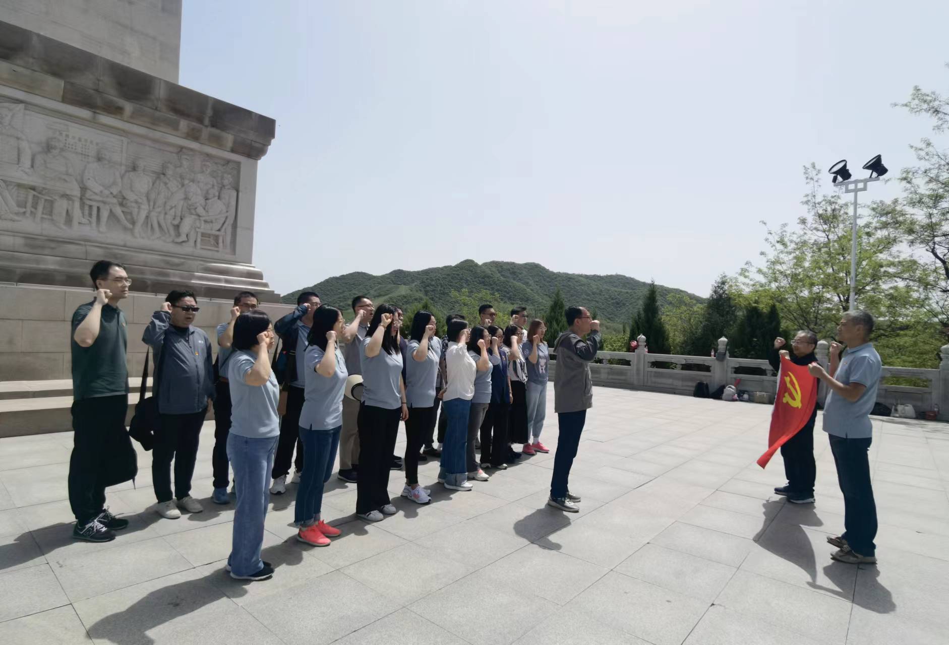随后在学院院长张杰的带领下,全体党员登上长长的石阶,来到陕甘宁革命根据地英雄纪念碑前,同志们站在阳光下,站在庄严肃穆的纪念碑前,面向党旗、郑重宣誓,重温了入党誓词。