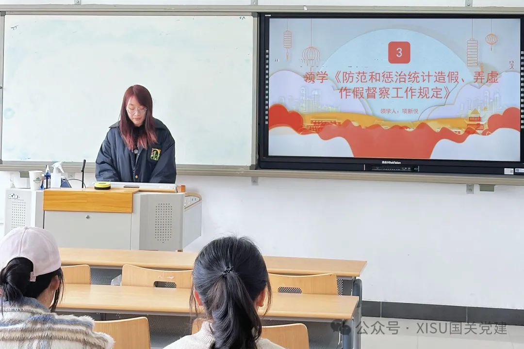 活动第三项,由项新悦和王萌萌同志领学《防范和惩治统计造假、弄虚作假督察工作规定》与《关于更加有效发挥统计监督职能作用的意见》。统计监督是党和国家监督体系的重要组成部分,是政府统计工作的一项基本职能。统计督察必须坚持以习近平新时代中国特色社会主义思想为指导,牢固树立“四个意识”,坚决做到“两个维护”,坚持新发展理念,紧扣我国社会主要矛盾变化,按照高质量发展的要求,统筹推进“五位一体”总体布局和协调推进“四个全面”战略布局。统计督察工作人员应当严格遵守政治纪律、组织纪律、廉洁纪律、工作纪律等有关纪律要求,加大现代信息技术运用力度,积极开展相关理论研究与实践探索,为更好发挥统计监督职能作用提供支撑。