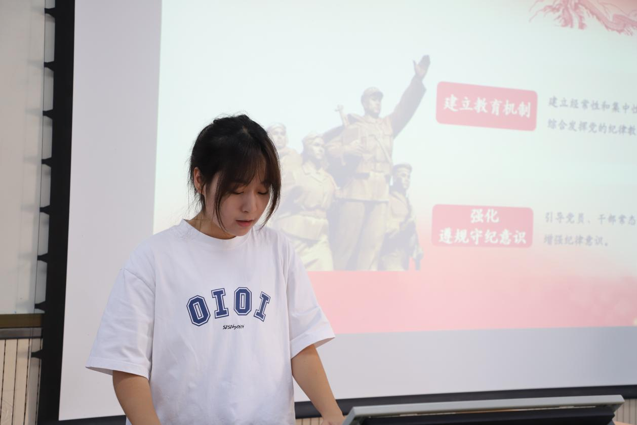 活动第二项,由学生第一党支部杨婧怡同学带领全体党员进行“明纪于心,守纪于行”主题教育学习。通过本次学习,党员同志们更加认识到纪律学习和教育须常态化,将学习成果转化为推动高质量发展的动力。加强党的纪律建设,铲除腐败滋生的土壤,规范党员干部行为;加强大学生党员的理想信念教育,树立正确的世界观、人生观、价值观,坚定马克思主义信仰和为人民服务的初心,肩负起历史使命。