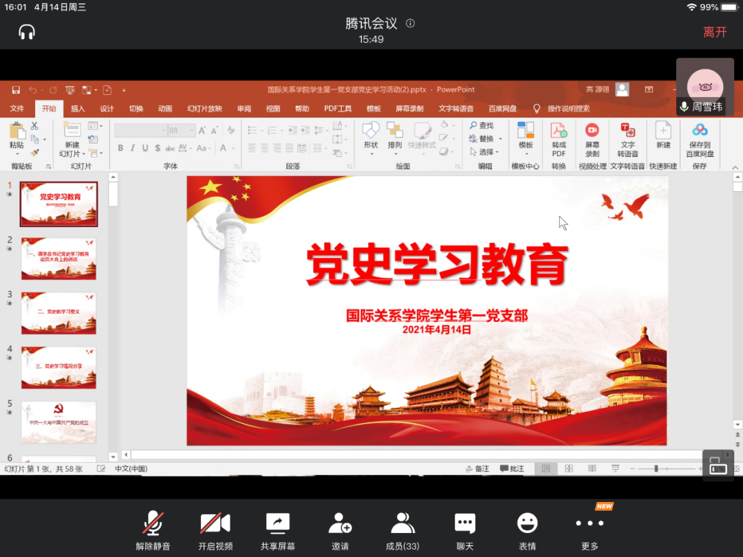 学生第一党支部于2020年4月14日通过腾讯会议线上的形式开展党史学习教育动员大会,会议由青年委员李妍主持,全体党员参加会议。