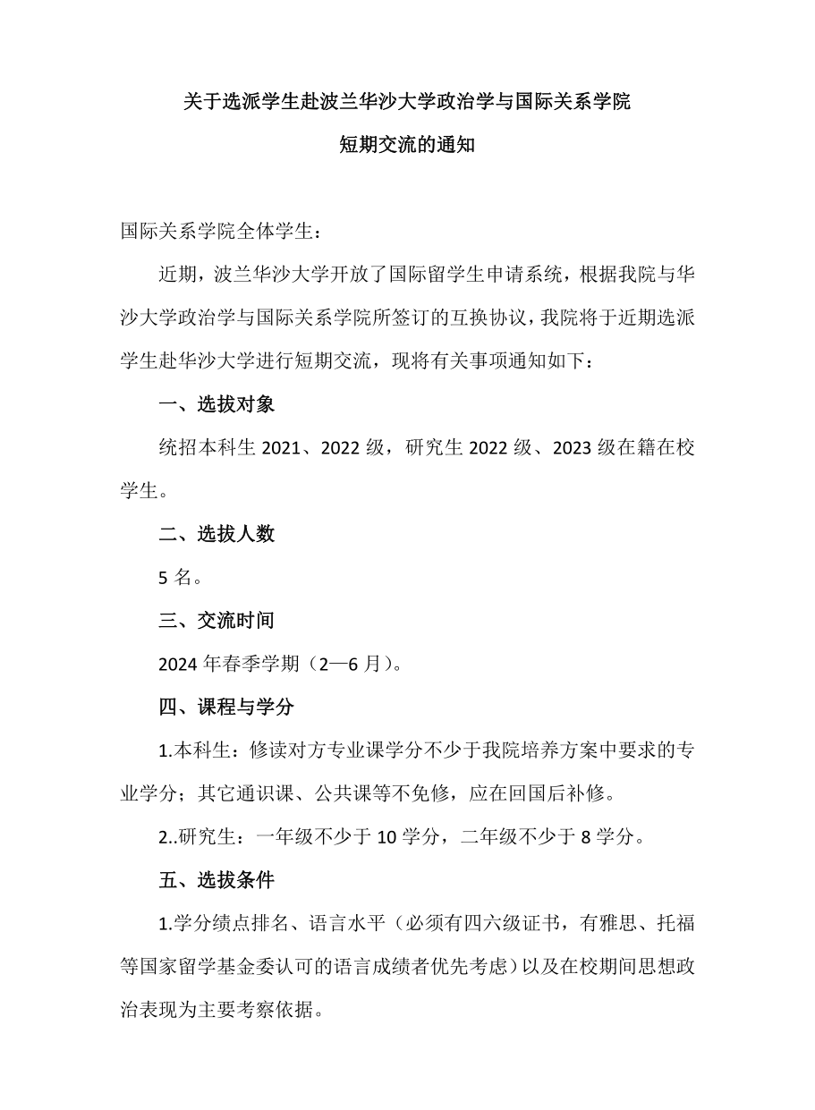 关于选派学生赴波兰华沙大学政治学与每日大赛 短期交流的通知